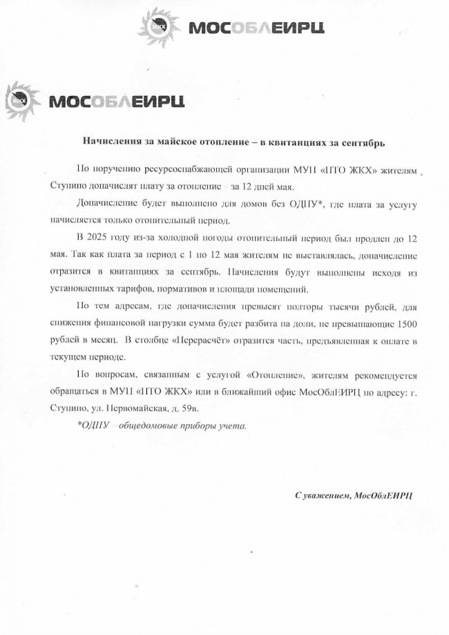 НАЧИСЛЕНИЯ ЗА МАЙСКОЕ ОТОПЛЕНИЕ - в квитанциях за сентябрь 2025года